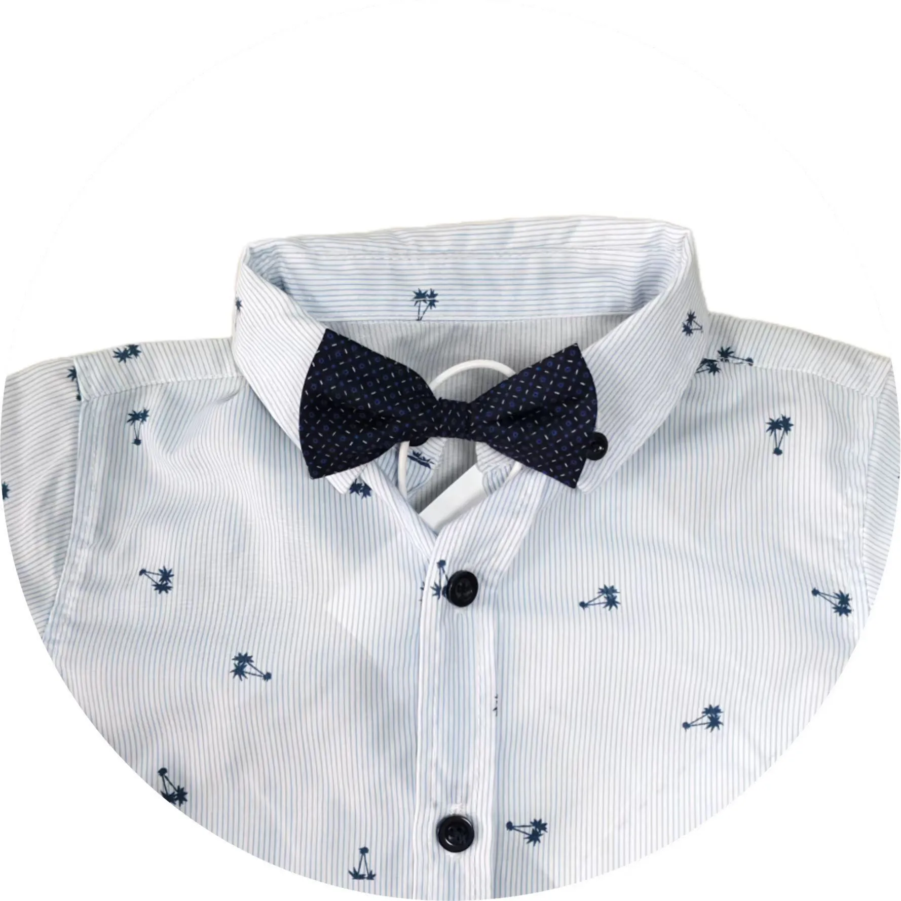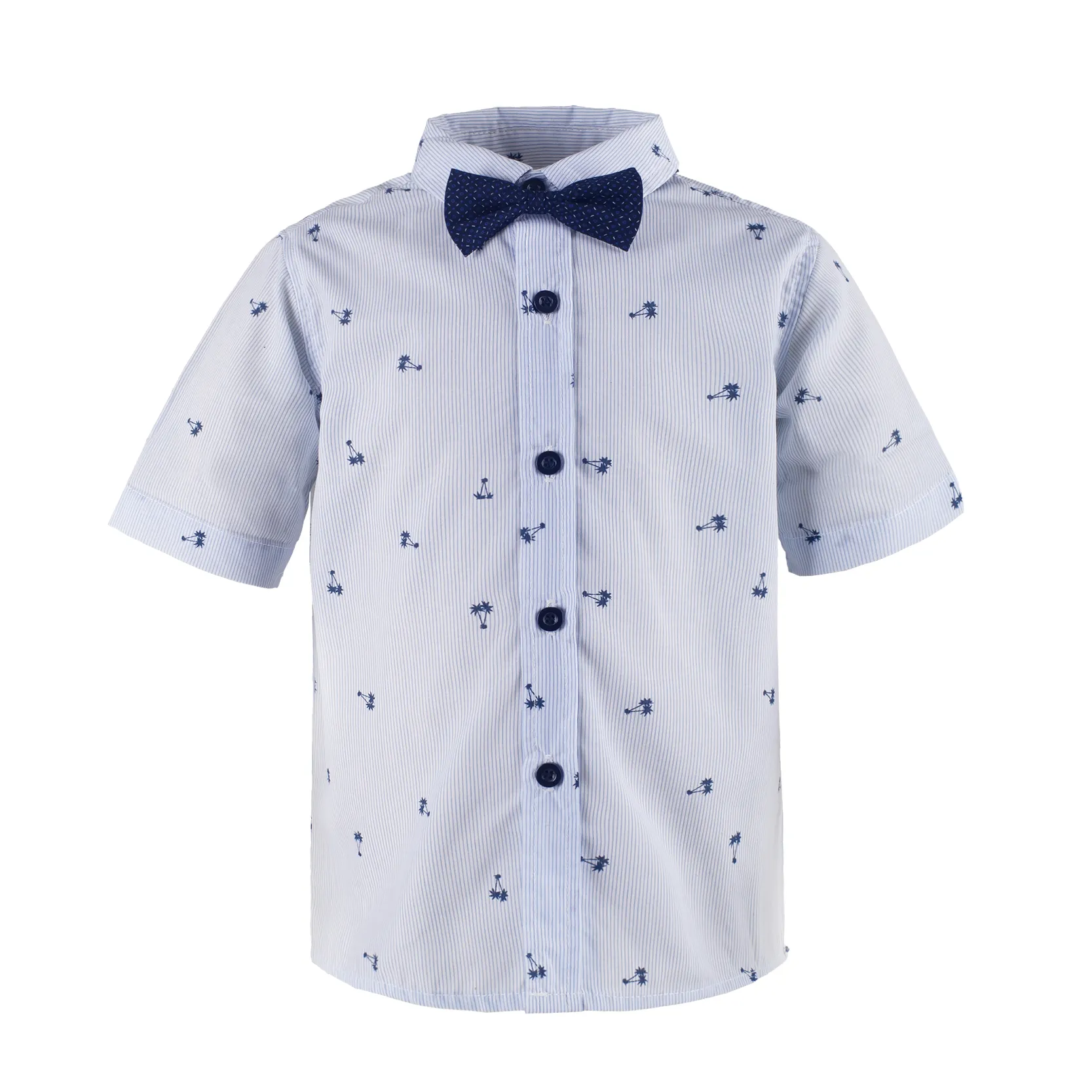 The design features a classic collar and short sleeves, providing a smart yet casual look. It is adorned with a delightful pattern of small, dark blue motifs scattered across a light blue background, adding a touch of whimsy. A navy - blue bow tie is attached at the collar, giving the shirt a dapper and formal appearance suitable for special occasions such as weddings, parties, or family photos.