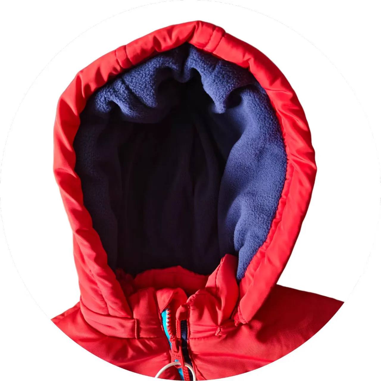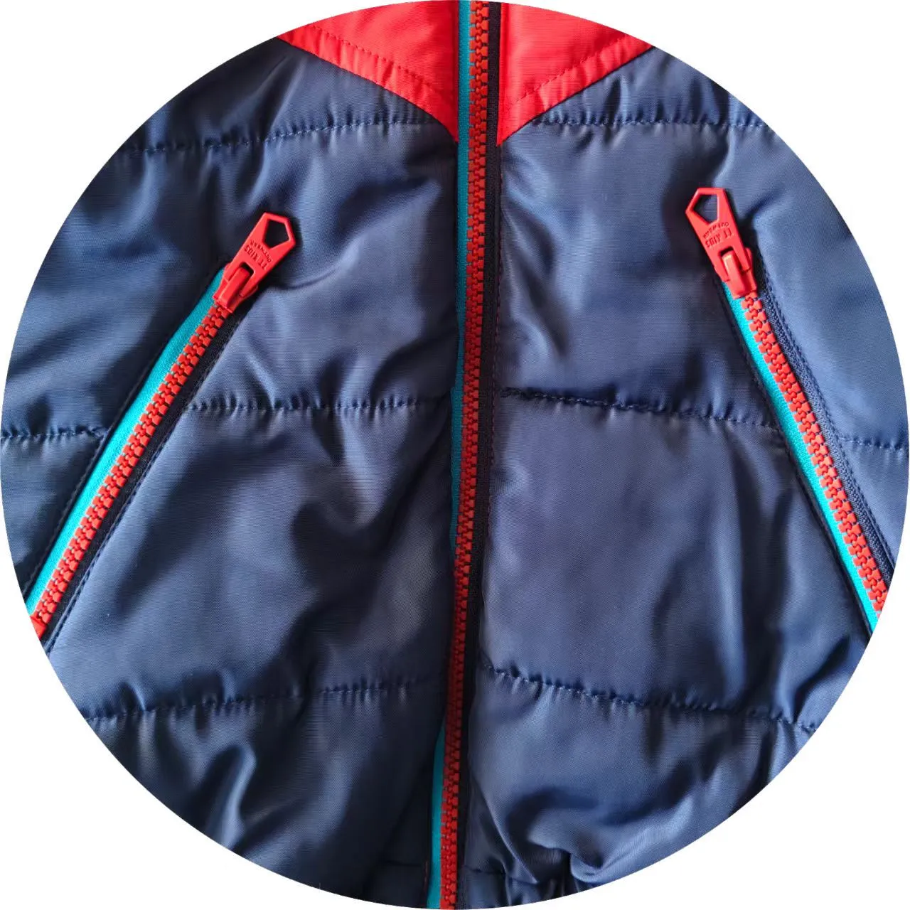 This color - block hooded puffer jacket is great. The red/navy/blue design is nice. It keeps kids warm in winter and outdoor play. Zippered pockets and hood are practical. Fits well too.