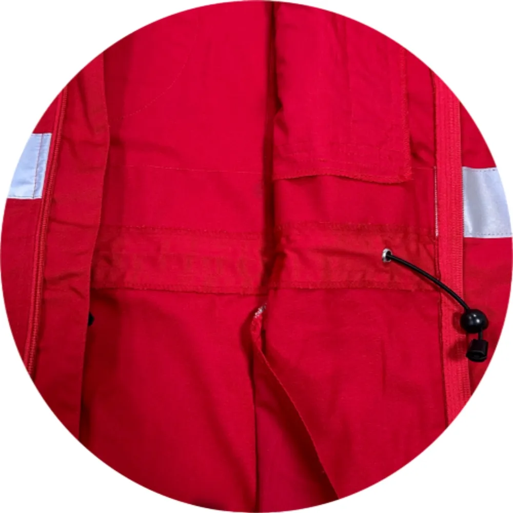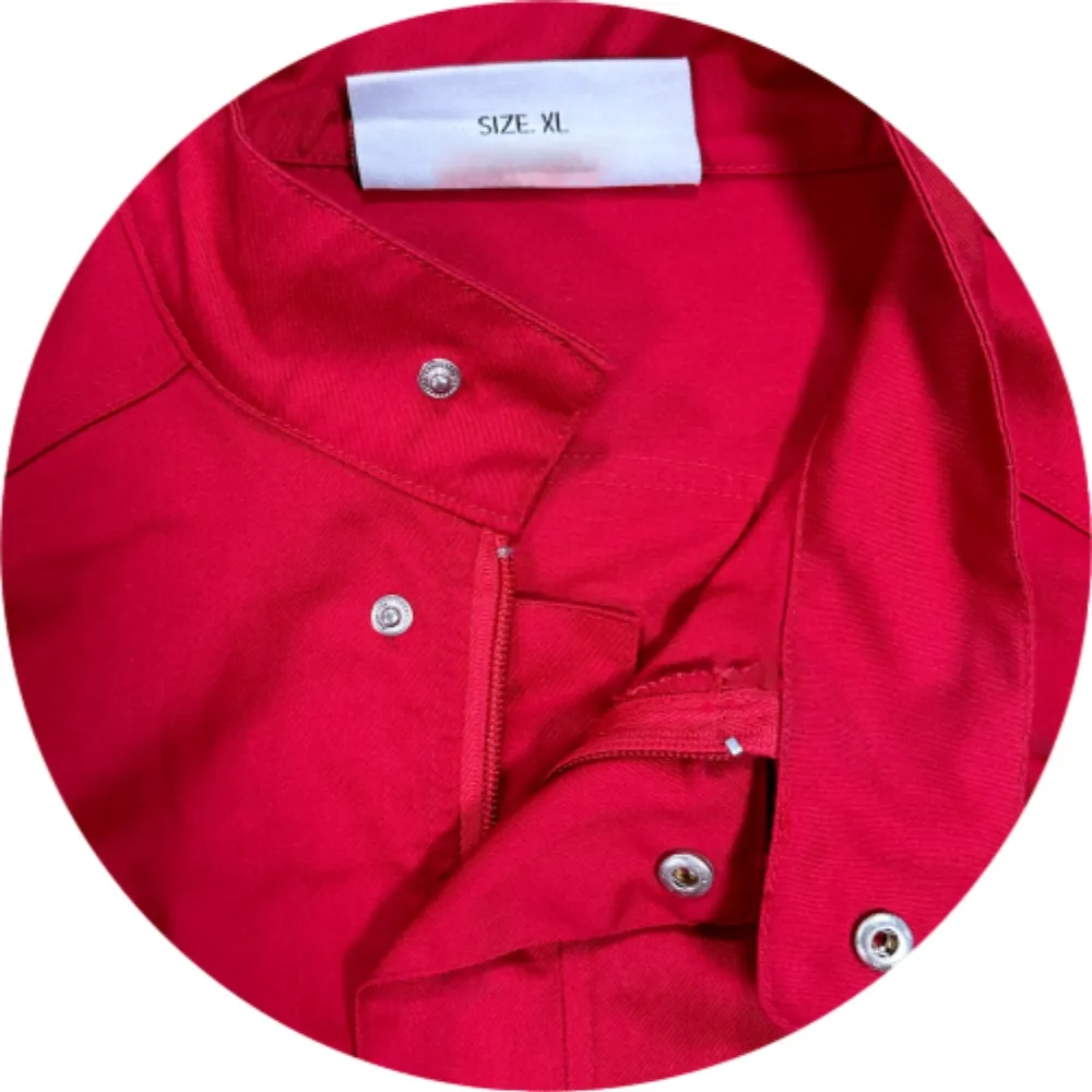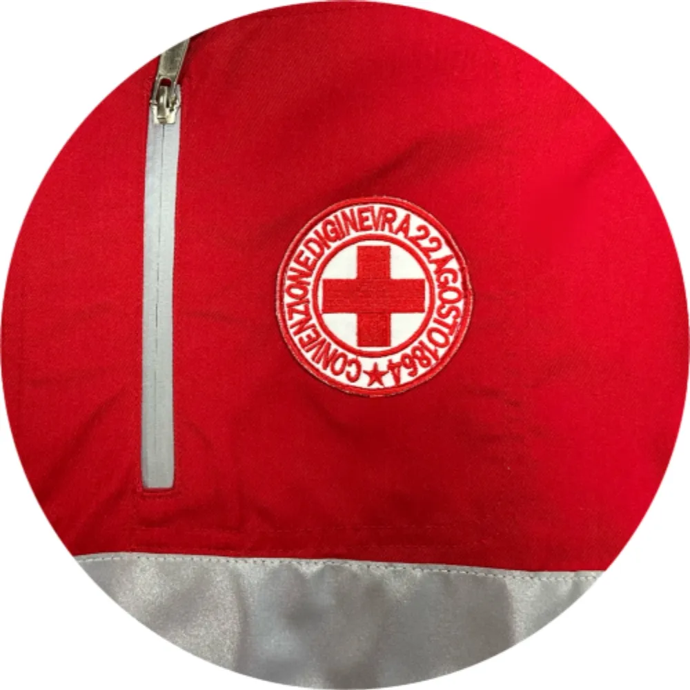 The color red is highly symbolic. It is the emblematic color of the Red Cross, representing the organization's identity and values. In emergency situations, this vibrant color helps Red Cross workers stand out, enabling quick identification among a crowd. It not only enhances the visibility of the workers but also instills a sense of trust and hope in those who see them. The red color, combined with the functional design of the jacket, makes them an essential part of the Red Cross work attire.