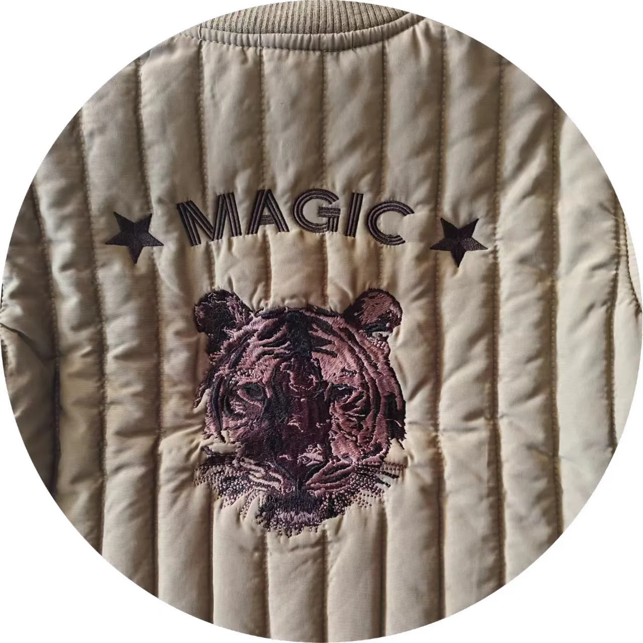 This children's winter khaki quilted coat, made of 100% polyester, keeps kids cozy. Durable, wrinkle-resistant, and lightweight, it withstands active play. Khaki is versatile, pairing easily with other clothes. It has a zippered front for easy dressing, multiple practical pockets, and a quilted pattern for extra warmth. Ribbed cuffs block cold, and a tiger pattern on the back adds style—great for winter.