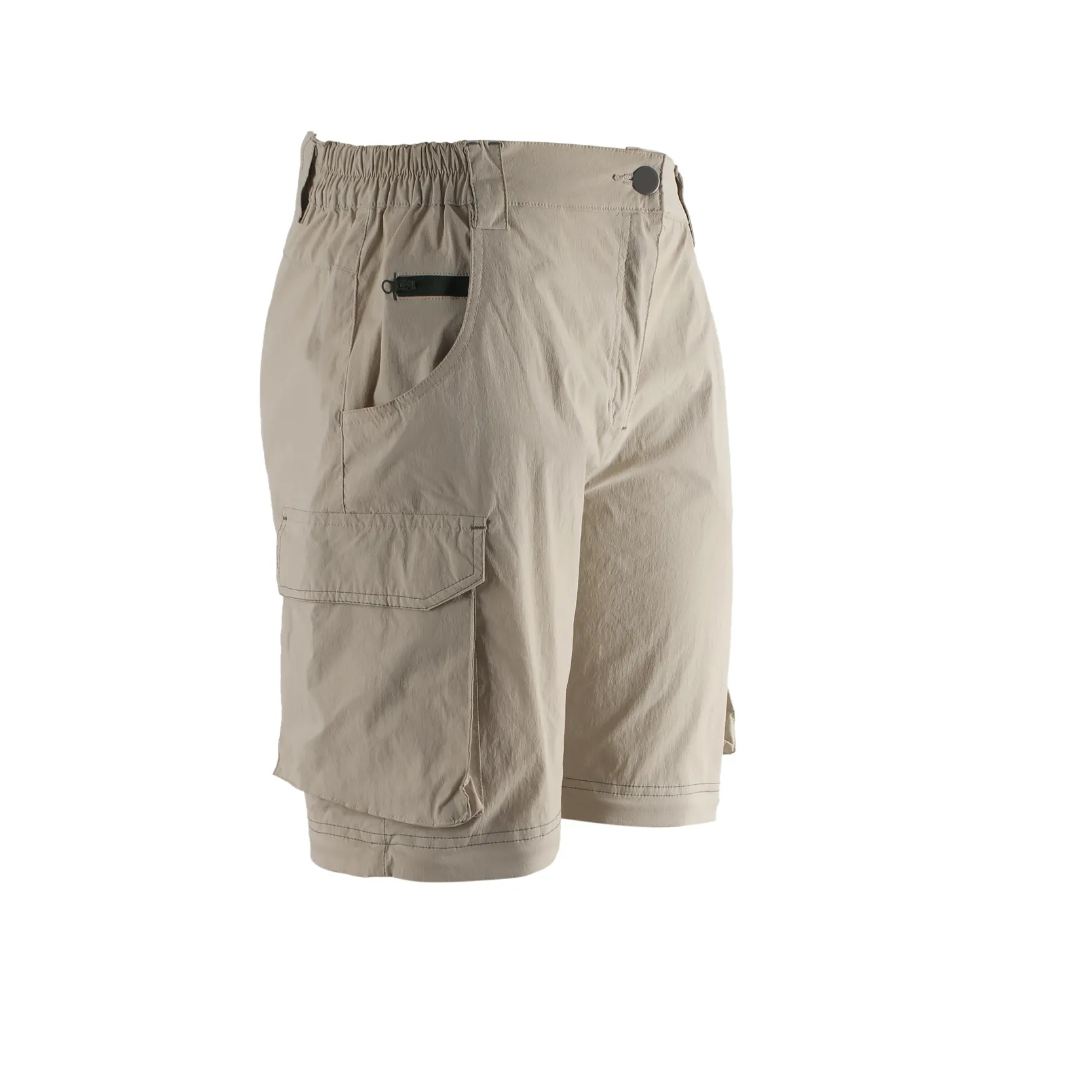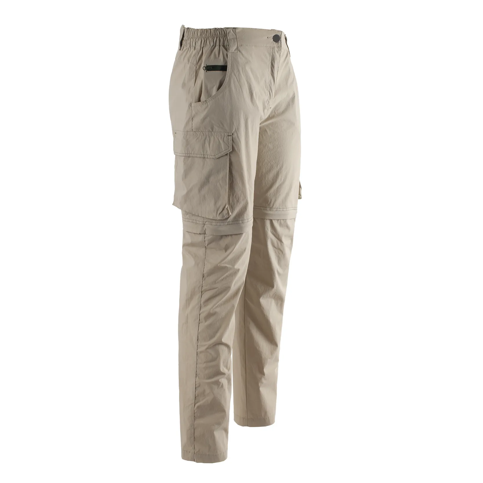 Men's detachable cargo pants are versatile and practical. Made of 96% polyamide (for durability/abrasion resistance) and 4% elastane (for stretchy comfort), they suit outdoor activities. Multiple cargo pockets store essentials like keys, maps, evenly distributing weight. A zipper enables transforming from long pants to shorts, adapting to weather changes. In neutral beige, they pair well with various outfits—dress up for the office or down for weekends. Ideal for men valuing function and comfort, fitting hikes, errands, and social gatherings.